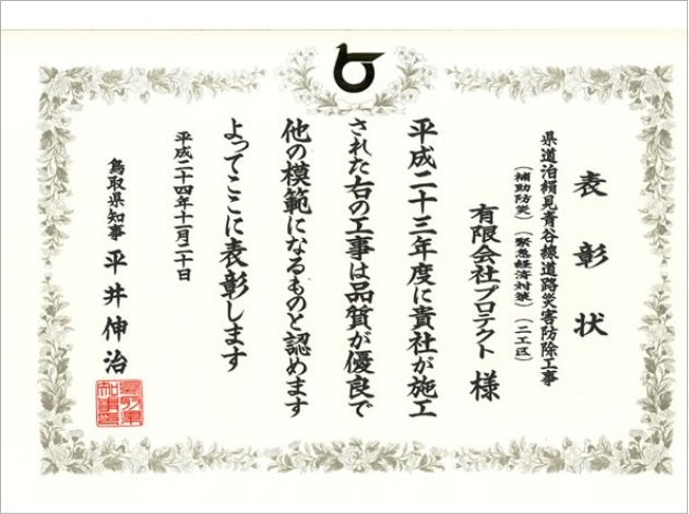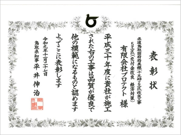 当社が施工した工事において、鳥取県より、優良工事表彰・優良下請業者表彰を受賞致しました。このことは、当社の長年の実績・経験から培った高い施工能力が評価されたものと自負しております。
